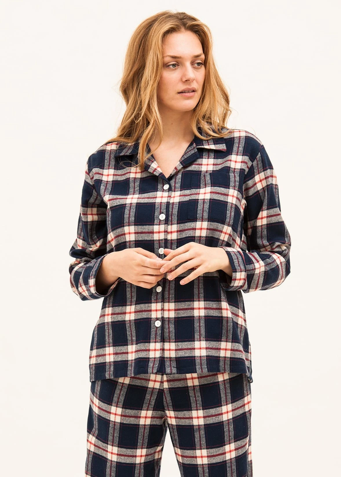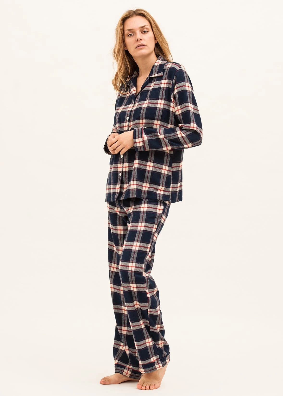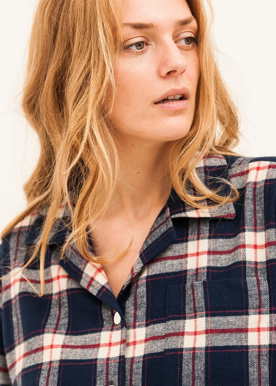 Warm and cosy winter pyjamas in a luxury brushed cotton blue and red check. You can rely on these to keep the wintry chills at bay. Traditional pyjamas finished with real shell buttons. Available in regular, tall and extra tall sizes. Complete the look with a pair of our charcoal grey alpaca bed socks.