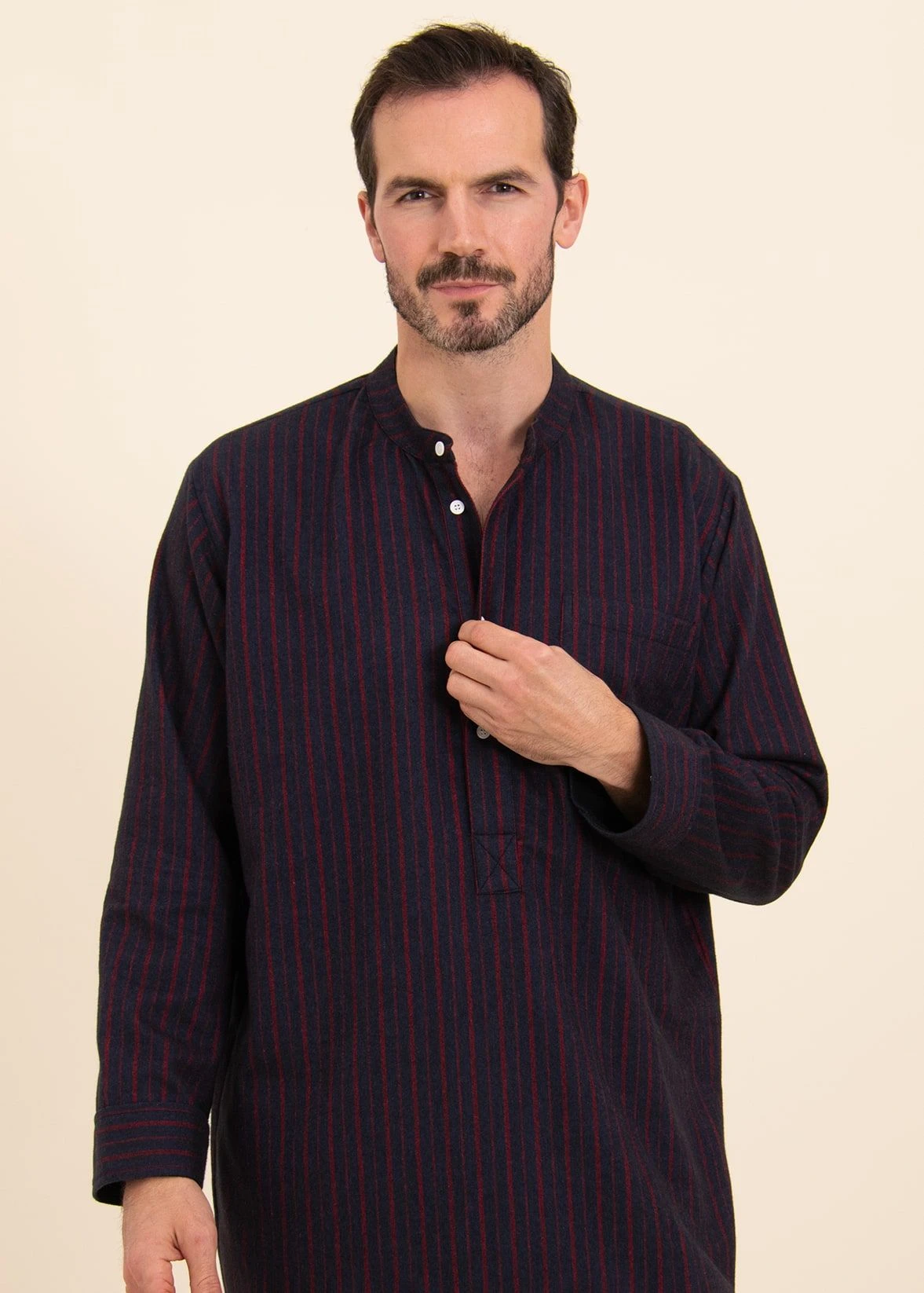 A stylish navy and red striped nightshirt in a luxury brushed cotton. Finished with a breast pocket, turn ups on the cuffs, real shell button, a chic mandarin collar and a gently scooped hem with a side split to allow ease of movement. Complete the winter look with a pair of our natural grey alpaca bed socks. Men’s pyjama bottoms, full pyjama set and dressing gown are also available in the same fabric.